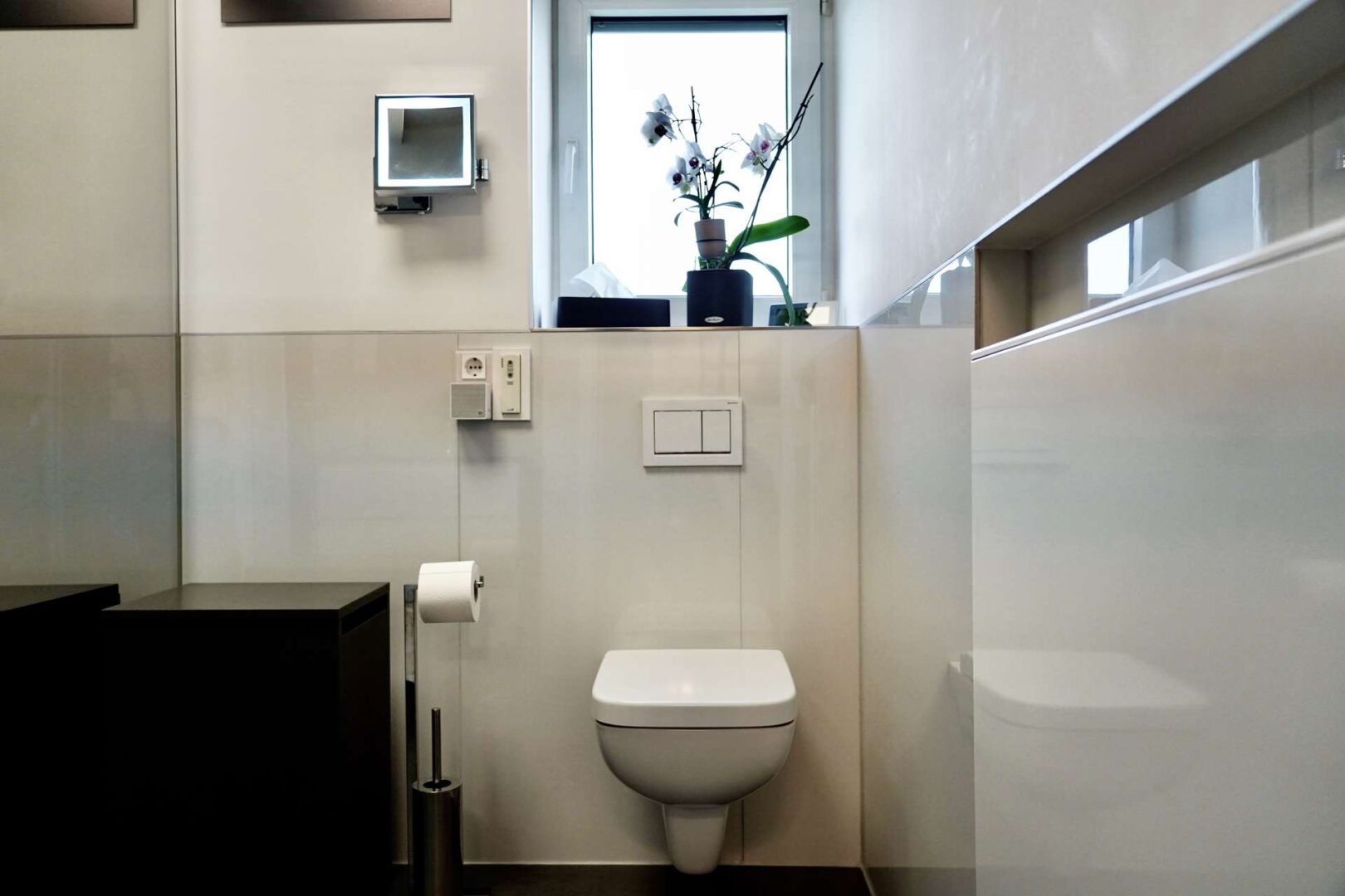 Waschbeckenunterschrank, E-Rollo am Fenster