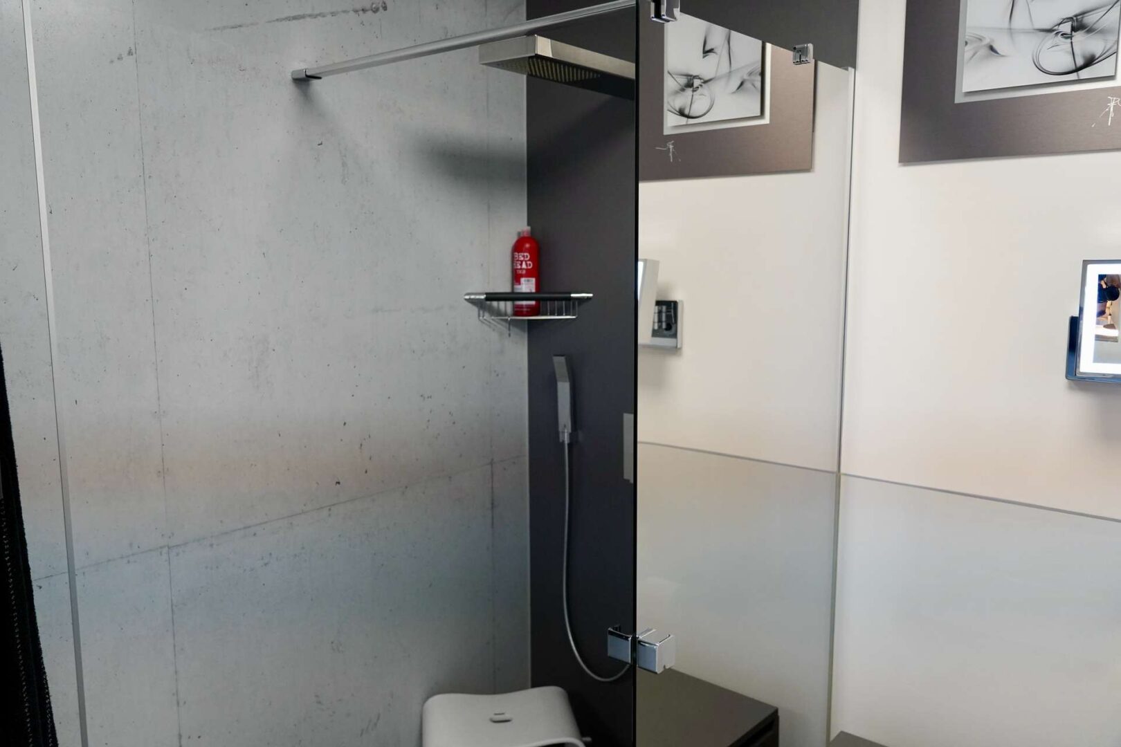 Das Badezimmer wurde komplett umgebaut und erstrahlt in neuem Glanz. Hochwertige Materialien und eine stilvolle Verkleidung der Badwände im Sichtbetonstil verleihen dem Raum ein exklusives Flair. Die Duschglaswand mit Abperlbeschichtung, die Dusch-Armatur und der geräuscharme WC-Sitz garantieren einen erstklassigen Komfort.